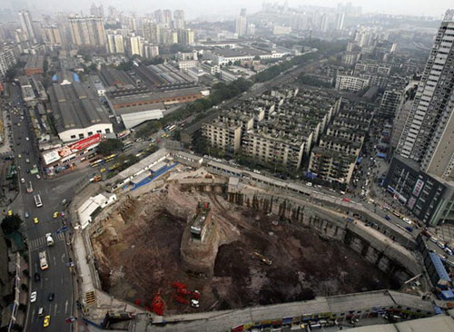 Mặc dù bị công ty xây dựng cắt điện, nước và đào đất sâu 10m xung quanh, gia chủ vẫn kiến quyết bám trụ tại căn nhà trơ trọi giữa công trường xây dựng. Ông chủ là Yang Wu, một nhà vô địch vơ thuật, làm một chiếc thang dây để trèo lên pḥng và dọa đánh bất kỳ người nào dám đuổi ông ta đi. Trong khi đó, người vợ là Wu Ping có kế hoạch mở một nhà hàng để kinh doanh ở tầng trệt ngôi nhà. Wu Ping thậm chí quảng cáo với truyền thông về ngôi nhà để gây áp lực với công ty xây dựng. Ngày 4/4/2007, sau quá tŕnh đàm phán kéo dài, gia đ́nh Wu chấp nhận chuyển đi v́ được đền bù một căn hộ mới cùng khoản tiền đền bù một triệu NDT.