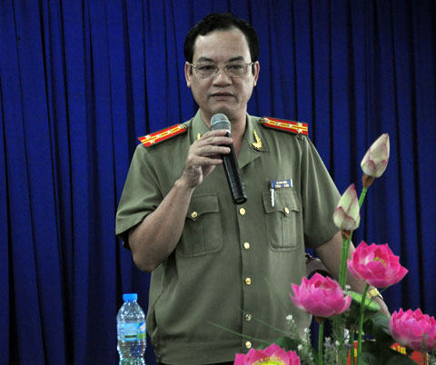 Đại tá Lê Anh Tuấn phát biểu trong cuộc họp. Ảnh: Quốc Thắng