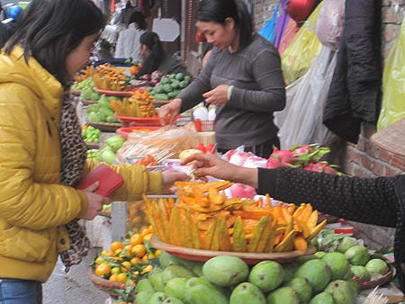 Các loại hoa quả dầm cũng là món ăn đường phố được nhiều người ưa thích bán nhan nhản tại các cổng trường học, cổng chợ. Đáng lo ngại là các loại xoài dầm, cóc dầm, dứa dầm... màu đỏ choét, ngọt lịm được phơi bày giữa đường không có che đậy.