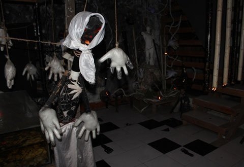 Đang lò dò bước vào thì tôi nghe tiếng hét của cô bạn. Vì thiếu ánh sáng nên cô nàng đụng đầu phải một vật gì đó. Ngước mặt lên thì muốn ngất xỉu khi thấy chiếc đầu lâu với hốc mắt đỏ lòm được treo lủng lẳng bên các miếng vải lụa trắng buông thõng như để thắt cổ.