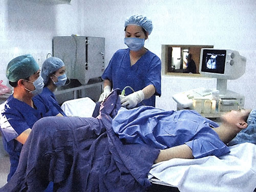 Tiến sĩ Quân Hoàng Lâm và các đồng nghiệp đang cấy phôi vào tử cung cho bệnh nhân
