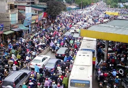 Bất chấp chuyện siết hộ khẩu, dân vẫn đổ về Thủ đô. Ảnh chụp đường Trường Chinh, Hà Nội giờ tan tầm. Ảnh: B́nh Minh