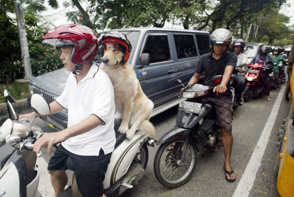 Siêu dễ thương với chú chó đội mũ bảo hiểm