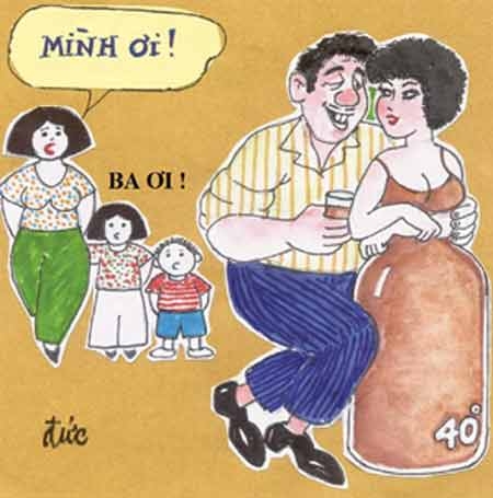 Một nữ đồng nghiệp ở nước ngoài đã gửi email hỏi: “Tại sao anh vẽ khuôn mặt của hai phụ nữ, một người (chính là chai rượu) mặt mày hớn hở cười thật tươi, còn người kia (là người vợ khốn khổ vì chồng không lìa chai rượu) cũng ráng nở nụ cười dù thống thiết kêu lên “Mình ơi”?”. Tôi trả lời: “Chị ơi, phụ nữ Việt Nam rất tuyệt vời! Họ luôn yêu thương, chiều chuộng và đặc biệt biết nhịn nhục đối với chồng mình dù hoàn cảnh thế nào”. Tôi trả lời như thế trong khi tâm trí đang đầy ắp hình ảnh bà xã tôi – một người phụ nữ nhịn chồng rất là hay, luôn nhịn cho đến khi tôi hạ hoả hoàn toàn.