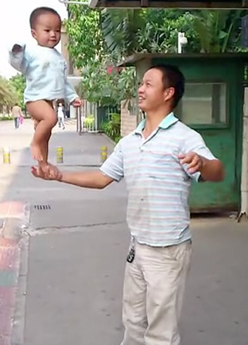 Bé một tuổi 'diễn xiếc' trên tay bố