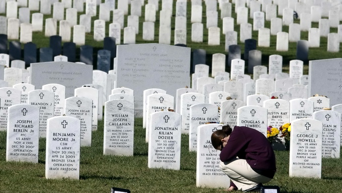 Một phụ nữ Mỹ khóc thương trước mộ chồng - một binh sĩ thiệt mạng tại Iraq - ở nghĩa trang quốc gia Arlington (Mỹ) - Ảnh: Reuters