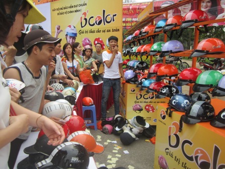 Hàng nghìn người kéo đến các khu vực công cộng như công viên Thống Nhất, đường Trần Nhân Tông, quận Hai Bà Trưng, Vườn hoa Hàng Đậu... để tham gia đổi mũ bảo hiểm cũ, mũ giả, lấy mũ bảo hiểm mới chất lượng cao do UBATGT QG phát động từ ngày 23/3 đến 25/3/2013.