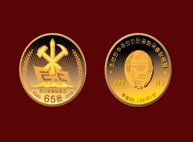 | Tiền xu vàng Triều Tiên đúc nhân dịp kỷ niêm 65 năm ngày thành lập đảng Lao động của nước này. |