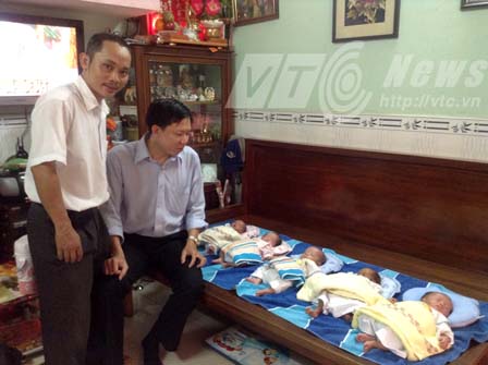 Hôm chúng tôi đến cũng là ngày đầu tháng các bé, cảnh tượng đầu tiên đập vào mắt chính là 5 cháu bé được cha mẹ đặt nằm trên tấm đi-văng theo một hàng dọc và được xếp theo số thứ tự từ 1 đến 5, lần lượt với các tên gọi Huynh - Đệ - Lộc - Phượng - Muội.