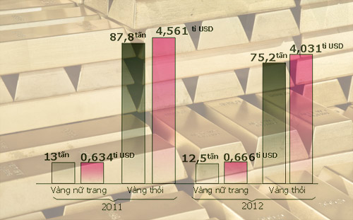Năm 2012, con số này cũng không kém với tổng cộng là 75,2 tấn, tương đương trên 4 tỉ USD. Riêng với vàng thỏi, trong năm 2011 và 2012, NHNN cũng không cấp phép công ty nào được nhập loại vàng này. V́ vậy, vàng thỏi chỉ có thể vào thị trường nội địa theo 2 con đường. Thứ nhất là NHNN cho phép các NHTM mua trạng thái nước ngoài và thứ hai là vàng thỏi nhập lậu.
