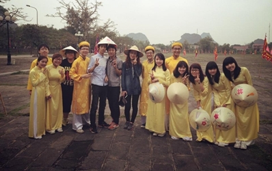 Đầu tiên chúng tớ tập kết từ sáng sớm rất sớm trước cổng đại học Công Đoàn để lên xe ô tô đi Ninh B́nh. Xe đến Ninh B́nh sau khoảng 2 giờ và tại đây chúng tớ được phát đồng phục là những chiếc áo dài màu vàng. Thay đồ xong, chúng tớ tập kết lại và được hướng dẫn “diễn” sao cho đúng bởi 1 anh phiên dịch viên người Hàn rất dễ thương.