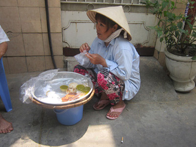 Người phụ nữ lai Pháp nhọc nhằn bán bánh rong kiếm ít tiền sống qua ngày. (Hình: Duy Thức)
