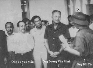 Tổng Thống Dương Văn Minh (2) ngày 30-4-1975 ở Dinh Độc Lập. Thủ Tướng Vũ Văn Mẫu (1) và nhà báo Bùi Tín (3)./File photo
