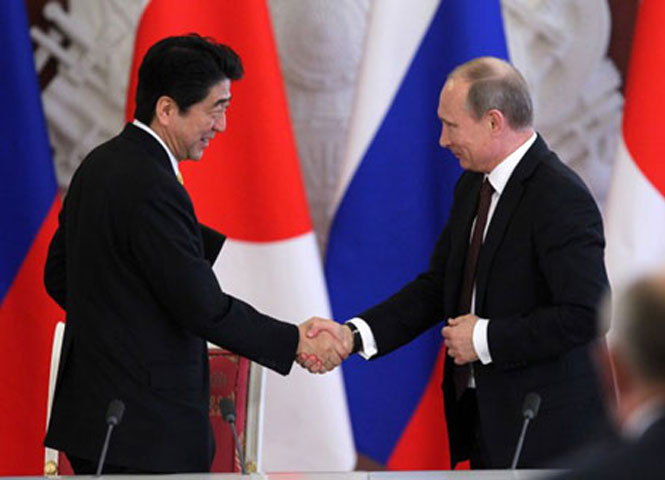 Ngày 30/4, Thủ tướng Nhật Bản Shinzo Abe đă kết thúc chuyến thăm Nga và có thỏa thuận với Tổng thống Nga Vladimir Putin để hai nước nối lại cuộc đàm phán về tranh chấp lănh thổ kéo dài. Giới quan sát phương Tây cho rằng, Nhật muốn tăng cường hợp tác với Nga v́ lo ngại trước sức mạnh quân sự và kinh tế của Trung Quốc. Ảnh Tổng thống Putin đón tiếp Thủ tướng Abe tại điện Kremlin.