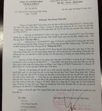 Trong kiến nghị gửi Thủ tướng Chính phủ, đại diện Vietracimex c̣n cho rằng thông báo số 178 này đă được Bộ GTVT “bí mật” gửi cho Văn pḥng Chính phủ mà không gửi cho các nhà đầu tư tham dự cuộc họp.