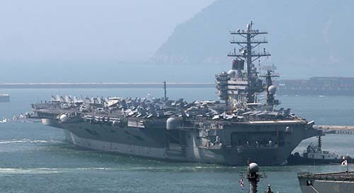 Tàu sân bay hạt nhân USS Nimitz của Mỹ rời cảng Busan ngày 13/5, tham gia tập trận chung với Hàn Quốc. AFP-TTXVN |