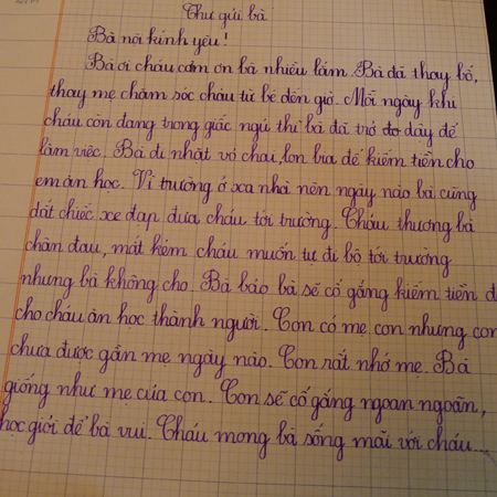 Bà ơi, cháu cám ơn bà nhiều lắm. Bà đã thay bố, mẹ chăm sóc cháu từ bé đến giờ. Mỗi ngày khi cháu còn đang trong giấc ngủ thì bà đã trở dậy để làm việc. Bà đi nhặt vỏ chai, lon bia để kiếm tiền cho cháu ăn học. Vì trường ở xa nhà nên ngày nào bà cũng dắt chiếc xe đạp đưa cháu tới trường. Cháu thương bà chân đau, mắt kém, cháu muốn tự đi bộ đến trường nhưng bà không cho. Bà bảo bà sẽ cố gắng kiếm tiền cho cháu ăn học thành người. Con có mẹ nhưng con chưa được gần mẹ ngày nào. Con rất nhớ mẹ. Bà giống như người mẹ của con. Con sẽ cố gắng ngoan ngoãn học giỏi để bà vui. Con mong bà sống mãi với con”.