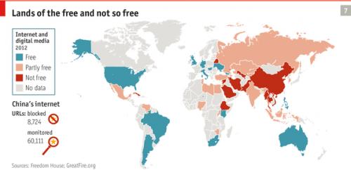Internet FreedomNhiều quốc gia ở châu Á và châu Phi đang sử dụng công nghệ của Trung Quốc trong cả việc cung cấp Internet cũng như việc kiểm soát cách thức sử dụng, và một số nước cộng ḥa ở Trung Á th́ dường như đang sử dụng công nghệ giám sát của Nga. Một số đất nước như Turkmenistan th́ thích sử dụng mô h́nh của Bắc Triều Tiên, tức là ít có mấy ai được vào mạng, và một số nước khác bao gồm Azerbaijan th́ không khuyến khích việc sử dụng Internet một chút nào. Kate Pearce tới từ trường Đại học Washington giải thích, Azerbaijan đă có một chiến dịch hiệu quả nhằm chống lại những thứ xấu xa của mạng Internet như các bệnh thần kinh, li hôn, buôn gái mại dâm và lạm dụng t́nh dục trẻ em. Cô cũng cho biết chỉ có một phần tư dân số Azerbaijan đă từng lên mạng và hiện đứng sau các nước láng giềng nghèo hơn của họ; và cũng chỉ có 7% sử dụng Facebook.
