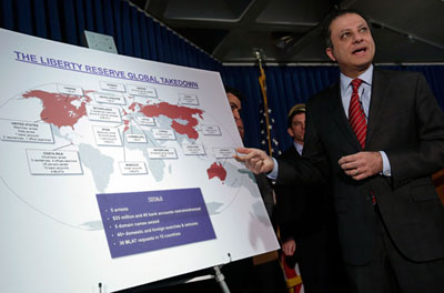 Ngày 28 Tháng Năm, công tố viên liên bang Hoa Kỳ họp báo ở New York loan báo chính phủ đã truy tố một vụ rửa tiền coi như lớn nhất thế giới do công ty giao dịch tiền trên mạng có tên là Liberty Reserve trụ sở chính ở Costa Rica.