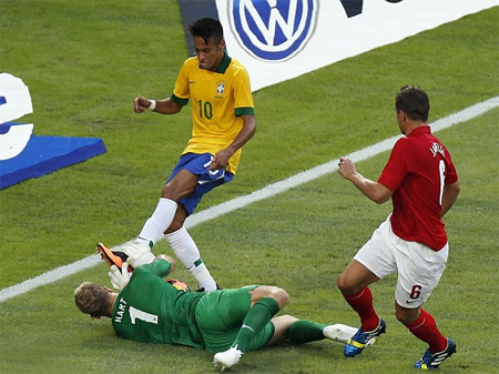 Các cầu thủ Brazil cố gắng phát huy bản sắc với lối chơi rộng khắp mặt sân cỏ, tuy nhiên tốc độ trận đấu cũng chỉ ở mức bình thường. Dường như đội tuyển vàng xanh vẫn thiếu một chút sắc nét để có thể đẩy cao tốc độ trận đấu nhằm xuyên thủng hàng thủ của tuyển Anh. Thi đấu vừa phải nhưng từ phút 20 đến 30, Brazil cũng có tới 4 lần bắn phá khung thành của đội khách.