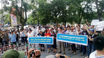 Những người tham gia cuộc biểu tình phản đối Trung Quốc xâm phạm chủ quyền của Việt Nam trên biển Đông, bày các biểu ngữ bày tỏ suy nghĩ và mong muốn của họ trước khi Công an Việt Nam xông vào giựt biểu ngữ, bắt người. (Hình: Internet)
