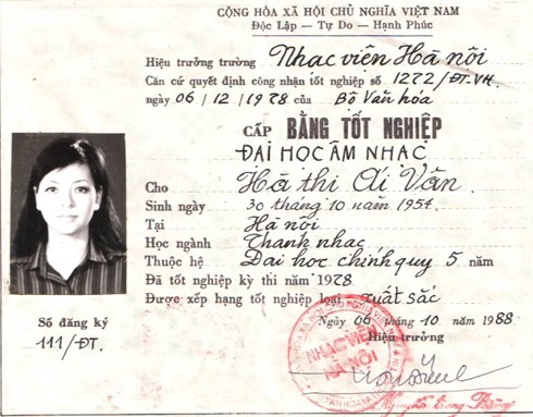 | Bằng Tốt nghiệp ĐH Thanh nhạc của Ái Vân. |