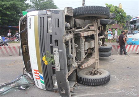 Tránh 2 vợ chồng say ngủ giữa đường, 2 ô tô lật nhào