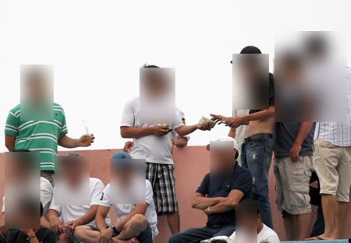 Khán đài C thường là nơi BTC bố trí cho đội khách, còn khán đài A có mái che dành cho BTC, khách VIP và khán giả có vé mời và giá vé cao hơn. Riêng khán đài D, nơi treo bảng tỷ số, có một nhóm khán giả thường xuyên đến đây vừa xem bóng đá vừa cá độ. Để hiểu rõ hơn về hoạt động của nhóm cờ bạc này, chúng tôi quyết định nhập vai con bạc thâm nhập thực tế.
