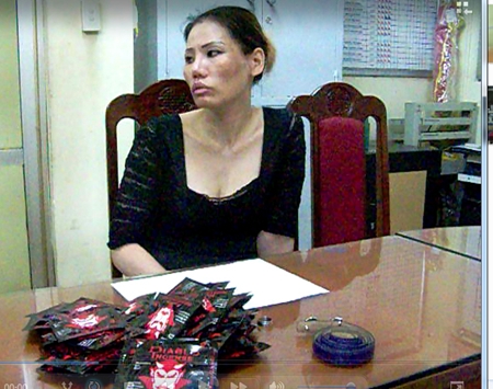 | Lê Thị Thanh Giang và số ma túy được nhét trong các vỏ bao cao su tại cơ quan điều tra. |
