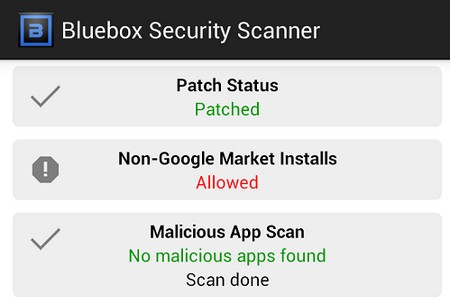 Tuy nhiên, trong trường hợp bạn muốn kiểm tra xem thiết bị của ḿnh đă được cập nhật bản vá lỗi hay chưa (có thể được cập nhật âm thầm mà bạn không hay biết) hoặc lỗ hổng bảo mật nghiêm trọng kể trên có ảnh hưởng đến thiết bị bạn đang sử dụng hay không, th́ ứng dụng có tên Bluebox Security Scanner do chính hăng bảo mật BlueBox Security phát hành sẽ hữu ích cho bạn.