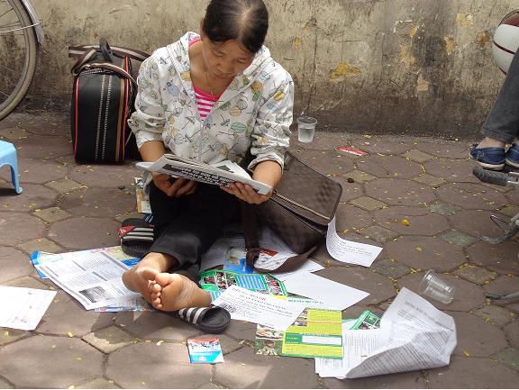 Vừa đến điểm thi của con, bác Nguyễn Văn Tùng- Hà Đông- Hà Nội đã được các tiếp thị viên đưa cho 5 tờ giấy tiếp thị của các cơ sở đào tạo như: Trung tâm Đào tạo Best..., Cơ sở đào tạo thiết kế thời trang cao cấp, trường Trung cấp điện ảnh... Bác Tùng cho biết : "Vừa mới đưa con đến thi chẳng biết các em từ đâu tới, đưa thì cứ cầm thôi, chứ đọc không hết, chưa kịp đọc đã có người đưa tờ khác tới".