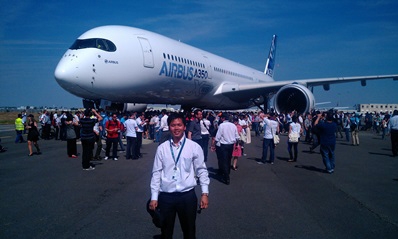 Cách đây không lâu, Airbus đã tiến hành bay thử thành công chiếc A350XWB và nhân dịp triển lãm hàng không Le Bourget (tổ chức 2 năm/lần) giữa tháng 6/2013, chiếc máy bay này cũng đã bay ngang bầu trời Paris để người tham quan có thể nhìn ngắm. Mình có may mắn được tham gia vào quá trình thiết kế của chiếc máy bay này với tư cách là kỹ sư tính toán cấu trúc của phần thân máy bay.