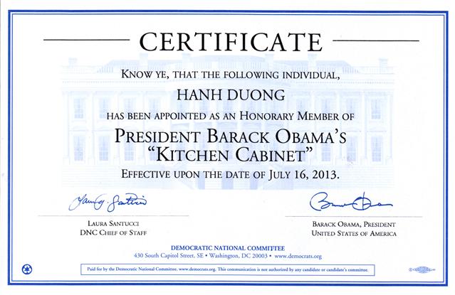 “Là một người tận tâm hỗ trợ cho Tổng Thống Obama, và là một nhà lãnh đạo của Đảng Dân Chủ trong khu vực của bạn, bạn chính là người mà Tổng Thống mong đợi cho sự hỗ trợ đó. Chính vì vậy, nay Tổng Thống Obama đề nghị bạn làm một Thành Viên Danh Dự của “Kitchen Cabinet” của Đảng Dân Chủ Toàn Quốc.