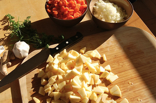 - Đổ nước dùng rau vào và nấu sôi trên lửa vừa. Thêm táo, và giảm nhiệt xuống mức trung bình. Đun nhỏ lửa trong 10 phút và món súp đã hoàn thành.