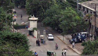 Nhân viên an ninh canh gác có xe thiết giáp tăng cường, trước cổng vào Lănh Sự Quán Hoa Kỳ ở Lahore, Pakistan, hôm Thứ Hai. Bộ ngoại giao Hoa Kỳ cho biết 19 đại sứ quán và lănh sự quán ở Trung Đông, Phi Châu và Nam Á sẽ c̣n tiếp tục đóng cửa đến cuối tuần v́ mối đe dọa của al-Qaeda. (H́nh: Arif Ali/AFP/Getty Images)