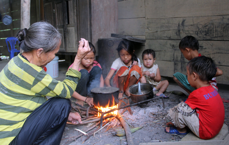 Thoắt nhìn 5 cháu nhỏ ngây dại Nguyễn Thị Thảo (13 tuổi), Nguyễn Thị Hiền (11 tuổi), Nguyễn Văn Huy (8 tuổi), Nguyễn Thiện Nhân (5 tuổi) và Nguyễn Yến Nhi (3 tuổi) ngồi quây quần bên bếp lửa cùng bà nội Nguyễn Thị Hoa đã ngoài 70 tuổi, mắt chăm chăm vào nồi cháo gạo đang nấu dở cũng đủ thấy mấy đứa trẻ tội nghiệp đã đói, đã thèm ăn đến nhường nào.