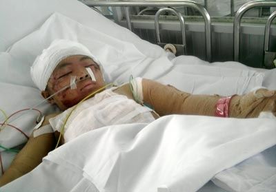 Nguy hiểm nhất là vết thương dài 15 cm lóc hết da vùng thái dương lộ ra một mảng sọ. Ngoài ra bé Vinh còn bị chấn thương sọ não, chấn thương ngực, bụng, gãy 1/3 giữa xương đòn trái.