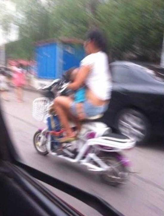 Bái phục bà mẹ trẻ vừa lái xe máy, vừa cho con bú