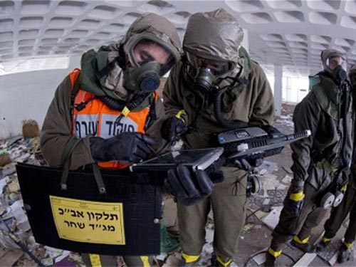 Binh sĩ Israel thuộc Bộ Chỉ huy Hậu phương thời chiến trong một cuộc tập trận vũ khí không quy ước ở Holon (Israel) Ảnh: EPA