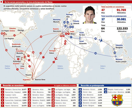 Cụ thể Messi phải di chuyển quãng đường lên tới 122,333 km chỉ trong vòng 64 ngày, trong đó có đến 90,483 km là quãng đường mà Messi phải di chuyển vì những lý do không liên quan đến Barcelona. Cuối tháng 6, Messi có mặt tại châu Phi để tham gia vào một hoạt động nhân đạo, sau đó di chuyển tới châu Mỹ để thực hiện tour du đấu biểu diễn “Messi và những người bạn”.