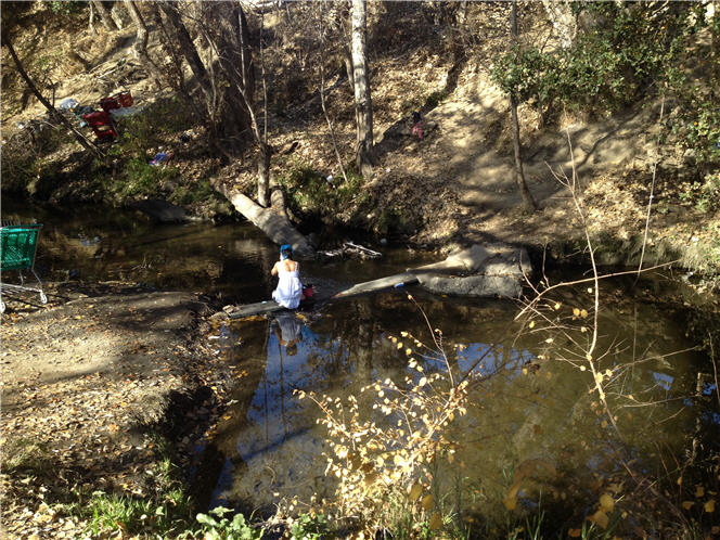 Đi một vòng xuống khu rừng cây hai bên bò suối. Dòng suối có nước chảy róc rách, cây khô trụi lá, những căn lều bạt đủ màu sắc giăng kín khu rừng. Trong đó có nhiều người độc thân, người có gia đình, đàn ông, thanh niên, phụ nữa và em bé. Cuộc sống có khó khăn và bất tiện. Không nước, không điện, không nhà, không có cả những phương tiện tối thiểu để nấu ăn. Những căn lều tạm bợ cất lên dưới những tàng cây bằng vật liệu kiếm được từ những đống rác, hoặc xin từ nhà thờ. Có rất nhiều chiếc xe đi chợ (cart) bỏ lăng lóc chung quang, và những đống bao ny-long, vật liệui phế thải…v.v. Những người sống nơi đây kiếm tiền bằng cách đi xin, hoặc lượm rác, bai bị, võ chai….bán cho các công ty thu mua phế liệu tái chế biến (recycle).