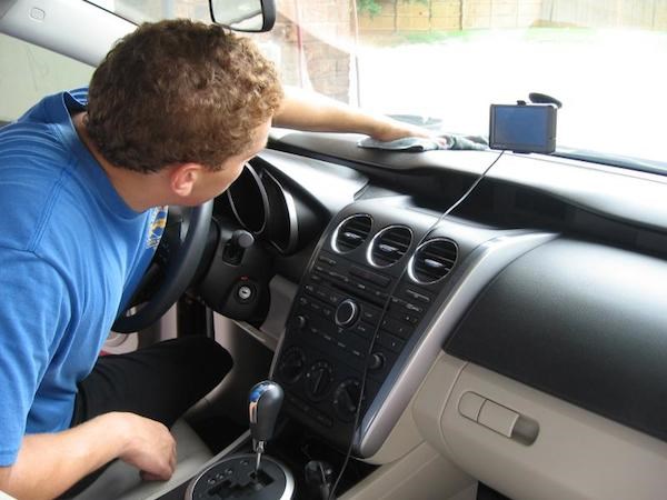 Chú ư: chỉ phun dung dịch rửa kính vào những phần vật liệu plastic, kim loại, thủy tinh không đục lỗ. Những phần vật liệu nào có đục lỗ, chẳng hạn như phần ghế ngồi có lỗ thông hơi phải phun dung dịch vào khăn lau, giấy lau hoặc bàn chải rồi dùng khăn, bàn chải này để chà xát, lau chùi. Sau khi lau cần dùng giẻ khô lau lại rồi dùng máy hút bụi để hút hết dung dịch tẩy rửa nếu không may lọt vào lỗ. Không phun chất tẩy rửa lên các núm vặn hay công tắc, chỉ nên phun dung dịch vào tấm giẻ, sau đó dùng giẻ lau các núm vặn, công tắc để tránh gây hư hỏng các chi tiết này.