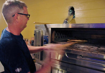 Ông Evan Danielle, chủ tiệm Neighborhood Pizza cho cái bánh pizza thịt trăn vào lò nướng hôm 28 Tháng Giêng 2014. (Hình: AFP Photo/Guillaume Meyer) |