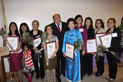 Một số phụ nữ gốc Việt được Thượng Nghị Sĩ Lou Correa vinh danh “Người Phụ Nữ Làm Nên Sự Thay Đổi 2014”. (Hình: Ngọc Lan/Người Việt)