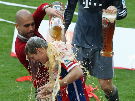 Đúng theo truyền thống, buổi lễ đăng quang của Bayern Munich được tổ chức hoành tráng và kèm theo bữa tiệc tràn ngập trong bia, thức uống đặc sản của xứ Bavaria. Đối với Pep Guardiola, ông lần đầu tiên được trải nghiệm qua việc tắm bằng bia.
