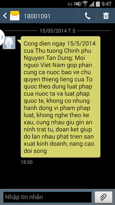Nội dung thứ 2 của MobiFone gửi đến khách hàng: Công điện ngày 15/5/2014 của Thủ tướng Chính phủ Nguyễn Tấn Dũng: Mọi người Việt Nam góp phần cùng cả nước bảo vệ chủ quyền thiêng liêng của Tổ quốc theo đúng pháp luật của nước ta và luật pháp quốc tế, không có những hành động vi phạm pháp luật, không nghe theo kẻ xấu, cùng nhau giữ gìn an ninh trật tự, đoàn kết giúp đỡ lẫn nhau phát triển sản xuất kinh doanh, nâng cao đời sống,