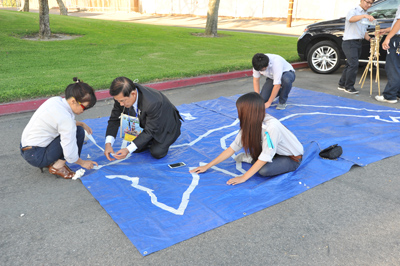 Trong khi đồng hương thưởng thức phần trình diễn văn nghệ, một số Phật tử thuộc gia đình Phật tử Việt Nam tại Hoa Kỳ hối hả hoàn tất tấm họa đồ có hình dáng chữ S bằng băng keo trắng.