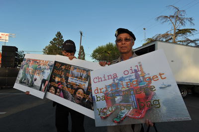 Hai cựu quân nhân mang theo các biểu ngữ tố cáo Trung Quốc mang giàn khoan vào biển Đông của Việt Nam đồng thời tố cáo nhà cầm quyền Việt Nam đàn áp nhân quyền. (Hình: Dân Huỳnh/Người Việt)