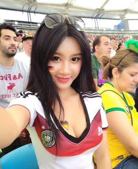 Hình ảnh của người đẹp châu Á gợi nhớ tới cô nàng Larissa Riquelme, fan nữ nóng bỏng nhất tại World Cup 2010. Năm nay, Larissa cũng tới Brazil nhưng vì thân hình quá béo sau lần chỉnh sửa nhan sắc, người đẹp Larissa không dám xuất hiện trên sân.