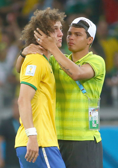 Thủ quân David Luiz (trái) và hậu vệ Thiago Silva của Brazil cùng khóc sau khi kết thúc trận thua Ðức 1-7 tại vòng bán kết World Cup 2014. Trong năm trận trước, Silva là thủ quân, và anh bị cấm đá trận với Ðức vì bị hai thẻ vàng trước đó. (Hình: Robert Cianflone/Getty Images)